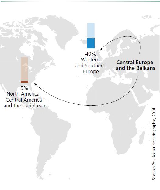 MAP 11: Destinations of trafficking victims from Central Europe and the Balkans, as a proportion of the total number of victims detected at specific destinations, 2010-2012