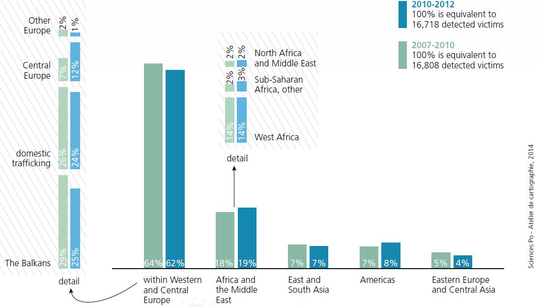 MAP 8: Origins of victims trafficked to Western and Central Europe, by subregion, share of the total number of victims detected there, 2010-2012