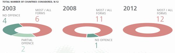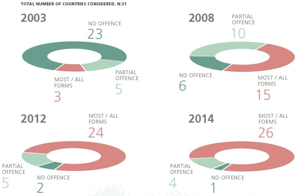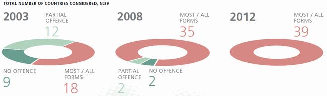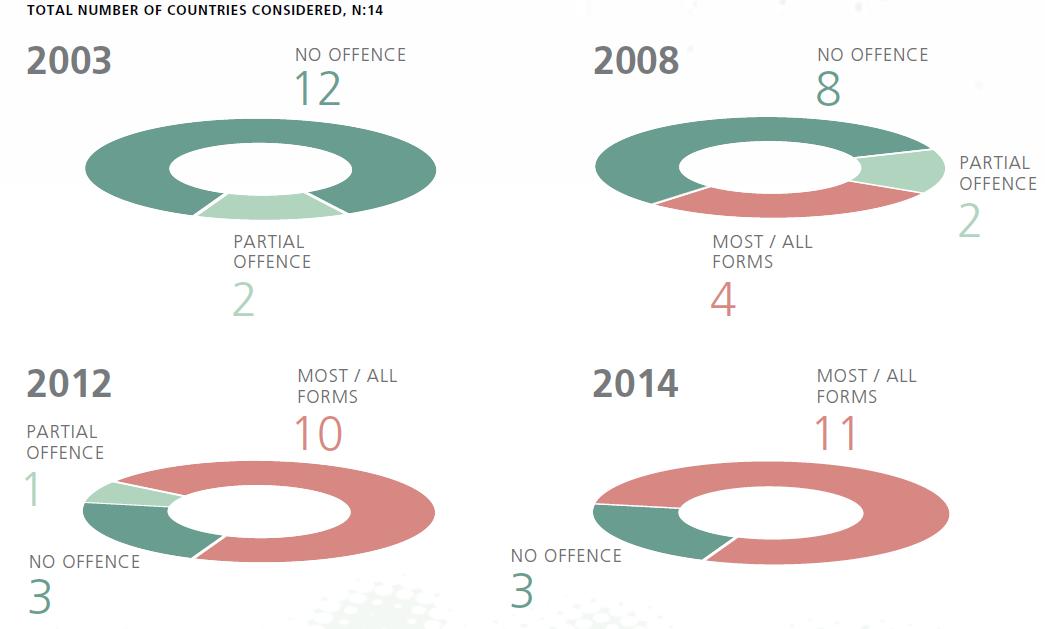 For North Africa and the Middle East, the situation in 2003 was similar to or worse than that of Sub-Saharan Africa. No country in North Africa and the Middle East had an offence that criminalized trafficking in persons as such. Only two countries had partial legislation (that focused on trafficking in children). Some improvements were reported in the first five years after the entry into force of the Trafficking in Persons Protocol, however, and by the year 2012 the majority of the countries in this sub-region had legislation that was in line with international standards.