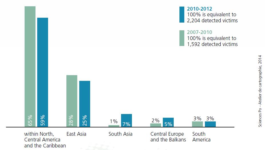 MAP 5: Shares of detected victims by subregional and transregional trafficking, 2010-2012