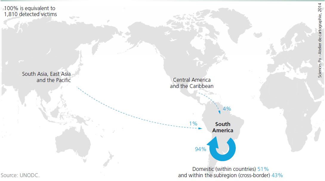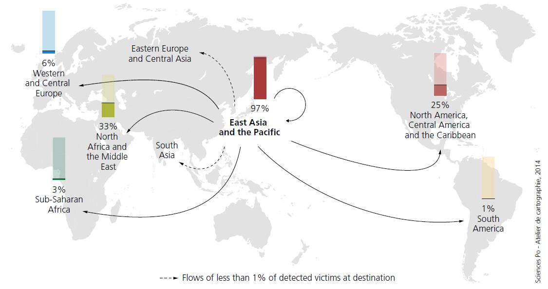 The main destinations for victims from the subregion of East Asia and the Pacific (outside of the subregion) are North America and the Middle East, and to a lesser extent Western Europe. Victims from East Asia and the Pacific are also being detected in Sub-Saharan Africa and episodically in South America and Eastern Europe. Victims do not originate from one country only, but from many of the countries in South-East Asia.