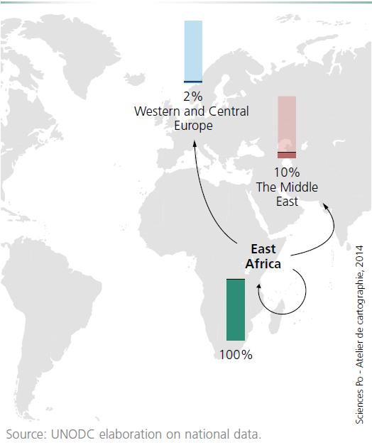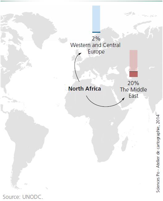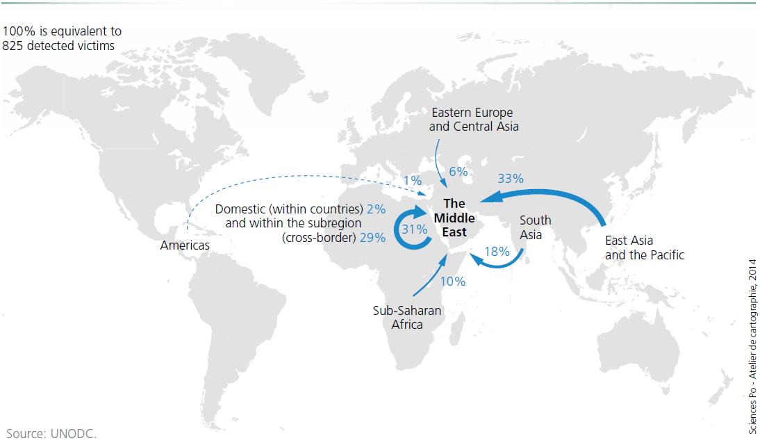 This breakdown reflects the fact that the Middle East is mainly a destination of trafficking from Asia. This area experiences relatively limited intraregional trafficking, while limited domestic trafficking is detected.