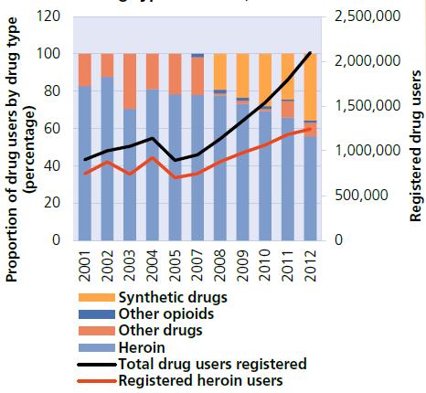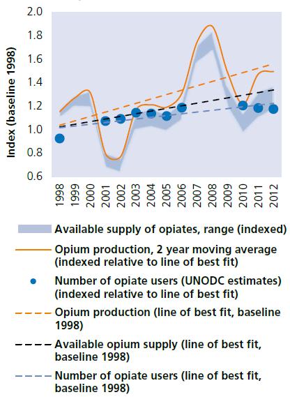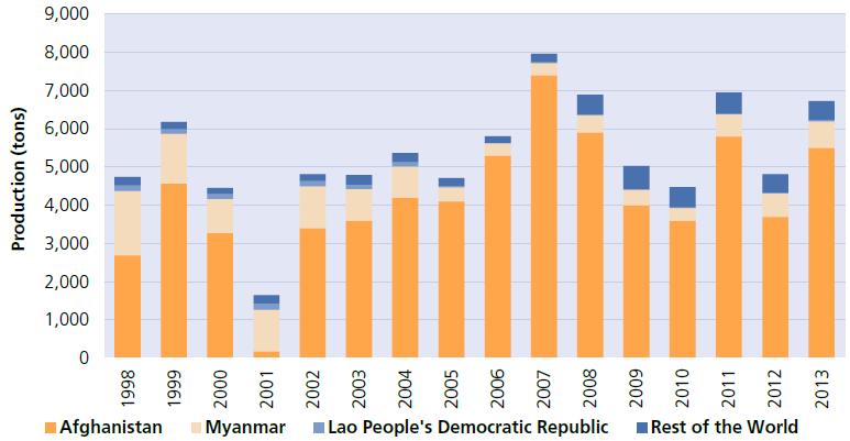 Opiates and opioids top the list of problem drugs that cause the most burden of disease and drug-related deaths worldwide. For the third consecutive year, Afghanistan, which has the world's largest opium poppy cultivation, saw an increase in the area under cultivation (from 154,000 hectares in 2012 to 209,000 hectares in 2013). In addition, Myanmar witnessed expansion in the area of opium poppy cultivation, although less pronounced. In 2013, the estimated global production of heroin rebounded to the levels seen in 2008 and 2011.
