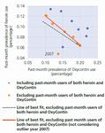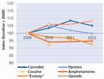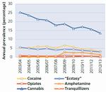 345. The correlation between annual prevalence and perceived availability of LSD turned out to be very strong during the 1996-2013 period, amounting to r = 0.93 (statistically significant at a = 0.01). The decline in perceived availability was much sharper than the decline in the perceived risk of harm during that period (see table 8). [Back]