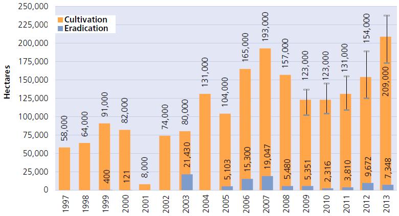 Cultivation data: UNODC estimates based on national illicit crop monitoring systems supported by UNODC supplemented by other official data.