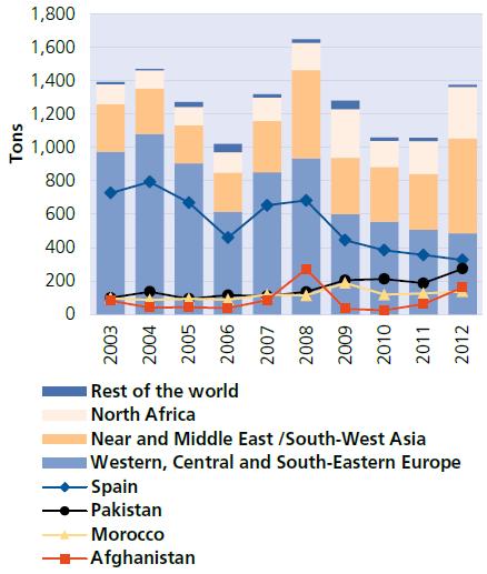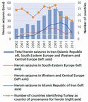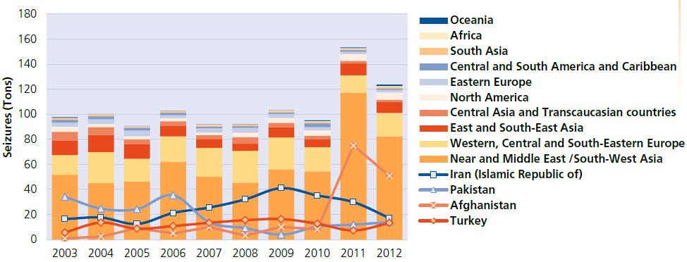 338. The estimate of 479 tons has been calculated as the average of annual heroin manufacture estimates, which are derived from annual opium production (686 tons of heroin in 2007, 600 tons in 2008, 427 tons in 2009, 383 tons in 2010, 467 tons in 2011 and 311 tons in 2012). While the annual heroin figures derived from opium production estimates may be incorrect for individual years as a result of the accumulation or depletion of opium stocks in such years, over a longer period of time such changes in stocks, in general, do not play much of a role. This suggests that the 2007-2012 average may be a good estimate for actual average annual heroin manufacture during that period. [Back]
