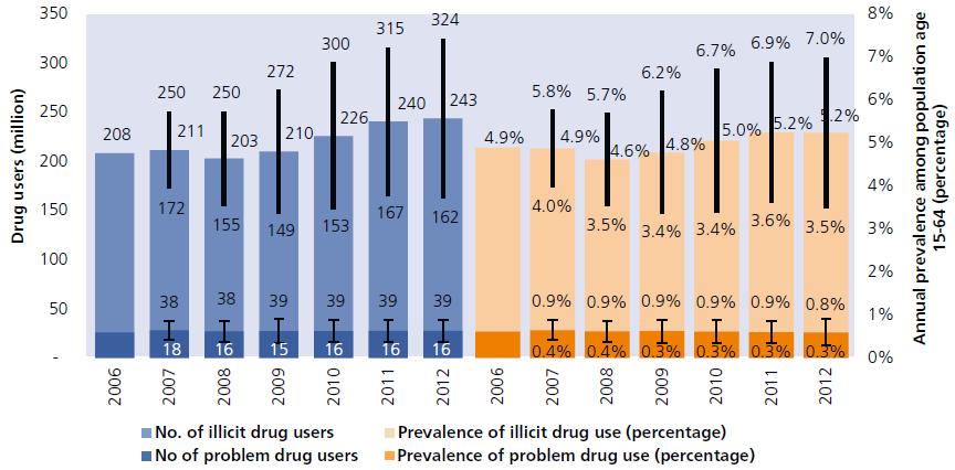 Globally, it is estimated that in 2012, between 162 million and 324 million people, corresponding to between 3.5 per cent and 7.0 per cent of the world population aged 15-64, had used an illicit drug -- mainly a substance belonging to the cannabis, opioid, cocaine or amphetamine-type stimulants group -- at least once in the previous year.