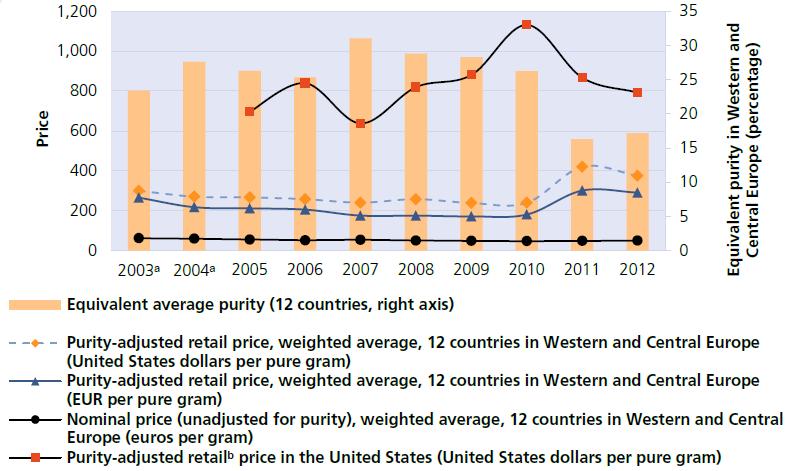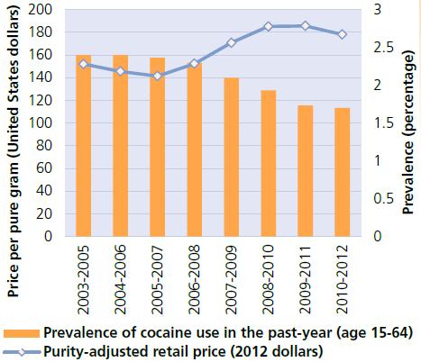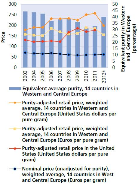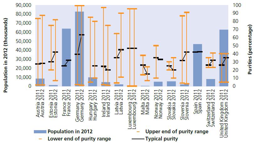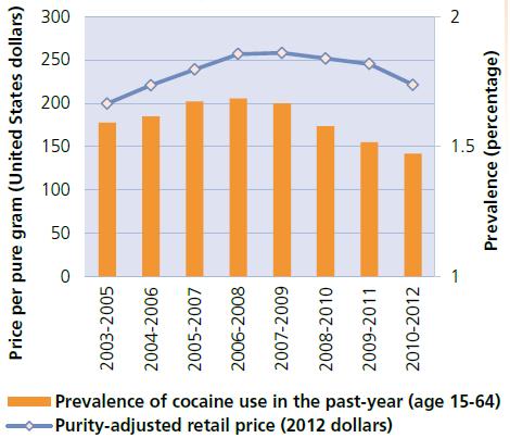 In Western and Central Europe, the second largest market after the Americas, indicators of overall supply suggest a possible rebound in the availability of cocaine; retail purity has increased in some countries with sizable consumer markets. On the other hand, they do not show an increase in demand. There has even been a decline in cocaine use in some of the countries that have had higher levels of use.