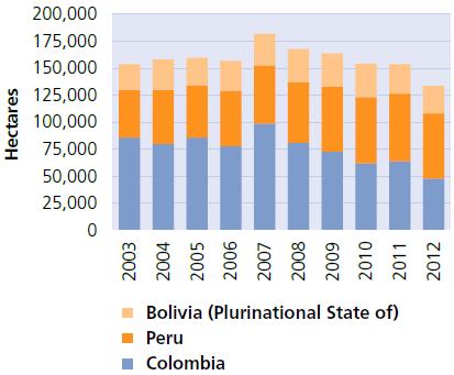 While cocaine manufacture and trafficking have had a serious impact in the Western hemisphere, there are indications that overall global availability of cocaine has fallen. The estimated net area under coca bush cultivation as of 31 December 2012 was the lowest since the beginning of available estimates in 1990: 133,700 hectares, a decline of 14 per cent from the estimate for 2011.