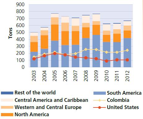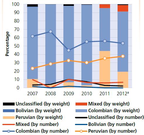 335. Global cocaine manufacture estimates amounted to between 1,024 and 1,064 tons for 2007, 865-1,122 tons for 2008, 842-1,110 tons for 2009, 788-1,060 tons for 2010, 776-1,051 tons for 2011 and 714-973 tons for 2012 (World Drug Report data). [Back]