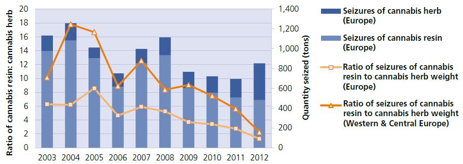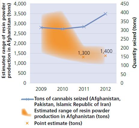 Cultivation and production of cannabis herb ("marijuana") remains widespread, while production of cannabis resin ("hashish") remains confined to a few countries in North Africa, the Middle East and South-West Asia. In Afghanistan, despite the fact that the area under cannabis cultivation has been decreasing, the potential cannabis resin production in 2012 was higher than in 2011 due to the greater yield per hectare.