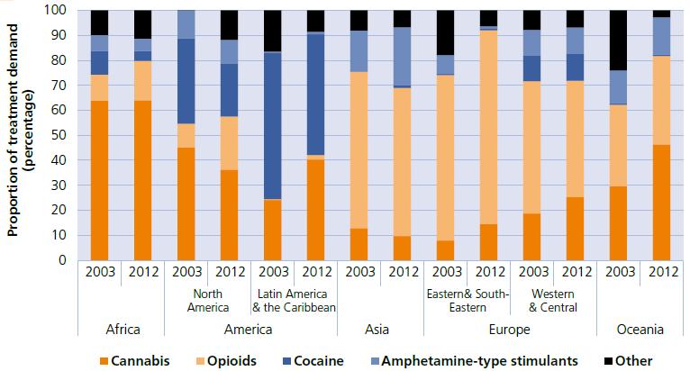 Although the general public may perceive cannabis to be the least harmful illicit drug, there has been a noticeable increase in the number of persons seeking treatment for cannabis use disorders over the past decade, particularly in the Americas, Oceania and Europe. Nonetheless, opiates remained the most prevalent primary drug of abuse among those seeking treatment in Asia and in Europe, as did cocaine in the Americas.
