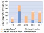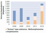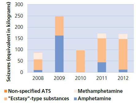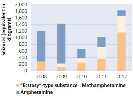 Seizures of "ecstasy" increased in 2012, with major quantities of "ecstasy" being seized in East and South-East Asia, followed by Europe (South-Eastern and Western and Central Europe), which together accounted for over 80 per cent of global seizures of "ecstasy".