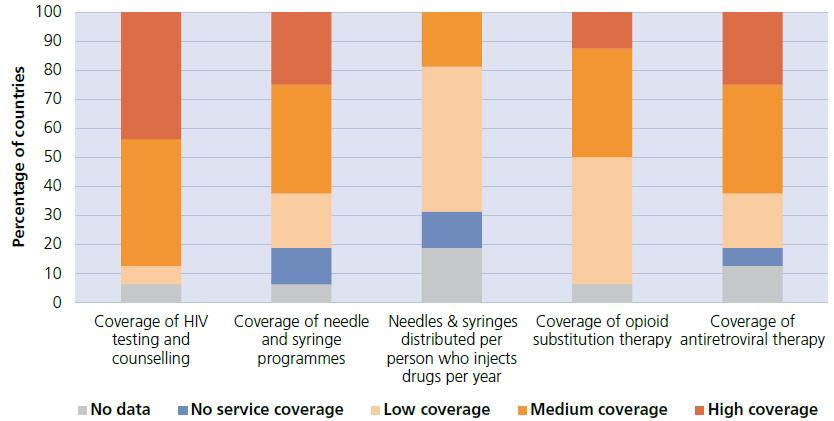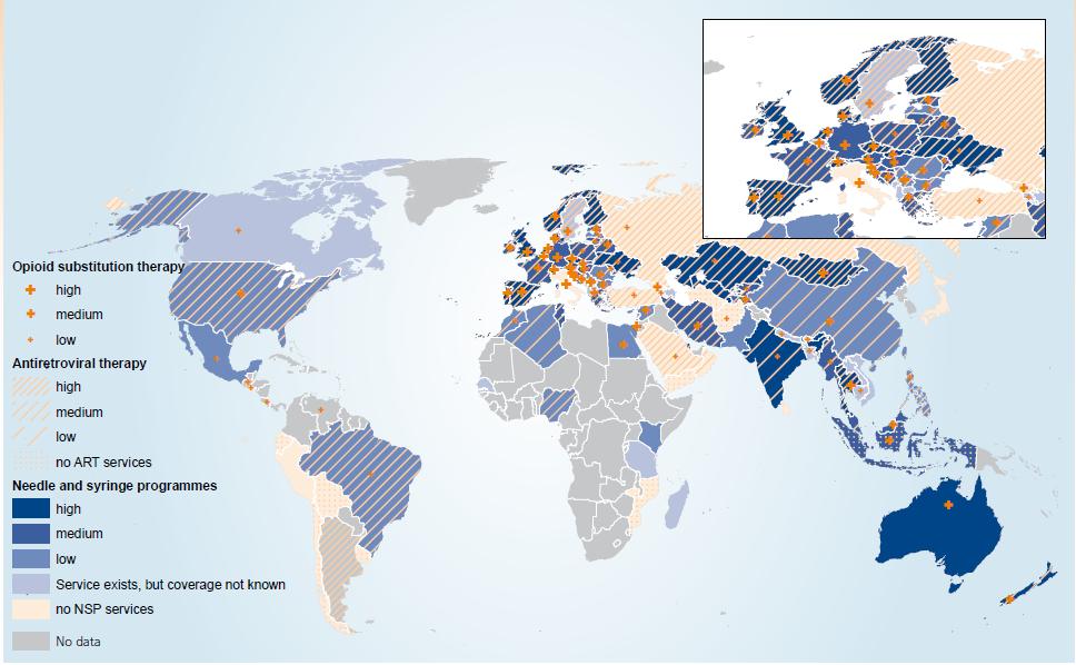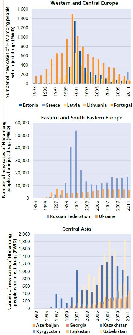 The coverage of the four most effective interventions is greatest in Western and Central Europe, where harm reduction interventions have been scaled up for more than a decade, leading to a decline in the number of newly diagnosed cases of HIV among people who inject drugs and of AIDS-related deaths attributed to unsafe injecting drug use. However, recent outbreaks of HIV among people who inject drugs in parts of Europe demonstrate how the HIV epidemic situation can change very rapidly in areas where services and interventions are scaled down.