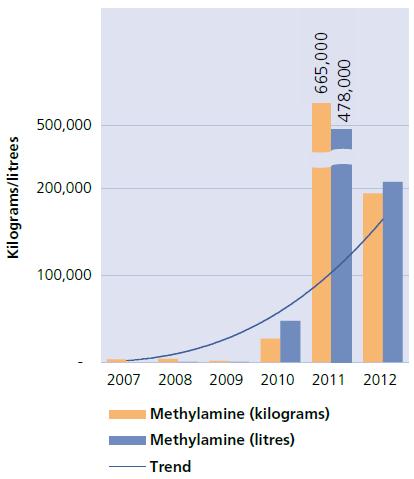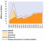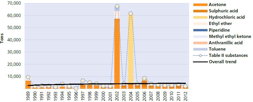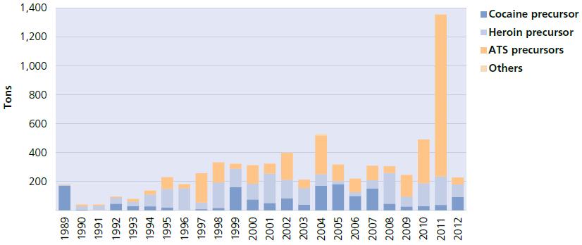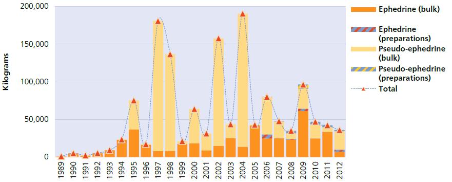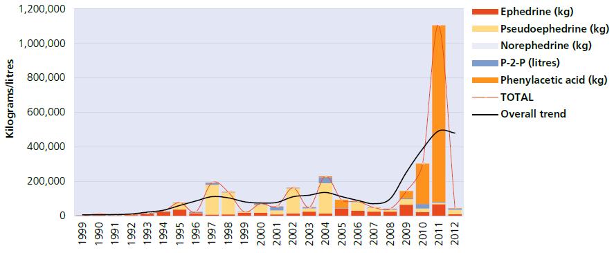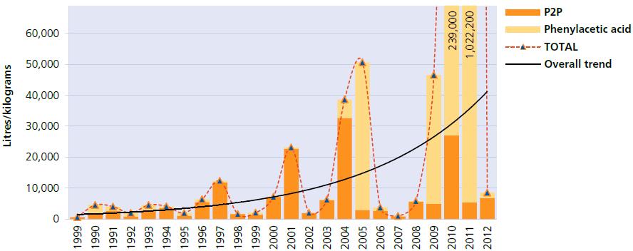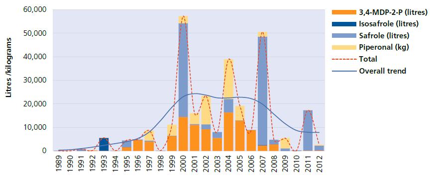 411. Global seizures in 2012: pseudoephedrine, 25 tons; ephedrine, 7 tons; P-2-P, 6,800 litres; phenylacetic acid, 2 tons; safrole, 2,000 litres; piperonal, 336 kg; 3,4-MDP-2-P, 228 litres; isosafrole, 10 litres (International Narcotics Control Board, Precursors Report, 2013, p. 81). [Back]