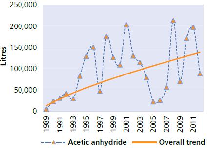 368. In 2013, the UNODC annual opium survey estimated heroin manufacture in Afghanistan at between 350 and 490 tons, which would have resulted in a demand for acetic anhydride of between 525,000 and 735,000 litres. Given an average price of $221 per litre according to this report, the acetic anhydride market in Afghanistan can be estimated to have ranged from $116 to $162 million in 2013. (Estimates based on data from UNODC, Afghanistan: Opium Survey 2013.) [Back]