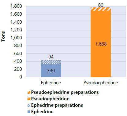 397. Average annual phenylacetic acid seizures at the global level amounted to some 217 tons per year over the period 2007-2012, seizures of ephedrine amounted to some 29 tons and seizures of pseudoephed-rine to some 18 tons. [Back]
