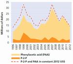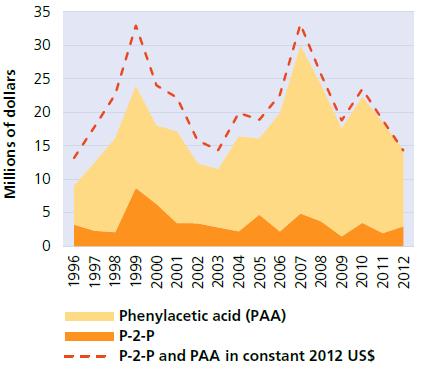 323. Based on international trade statistics collected by the Board, seizures of P-2-P were equivalent to 15 per cent of international trade, and phenylacetic acid equivalent to 11 per cent of international trade during the 2007-2011 period. (International Narcotics Control Board, Precursors Report, 2012, table 1.) [Back]