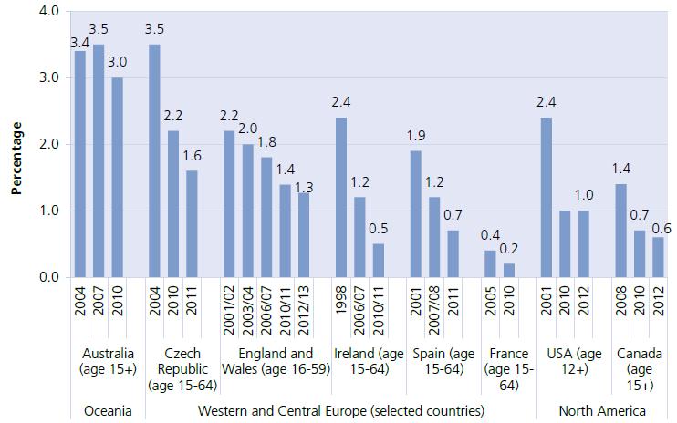 343. Annual prevalence of LSD use among young adults (aged 15-34) fell in Ireland from 2.9 per cent in 1998 to 0.6 per cent during the period 2010-2011; in Latvia from 1 per cent in 2003 to 0.1 per cent in 2011; and in Hungary from 1.3 per cent in 2001 to 0.3 per cent in 2007 (European Monitoring Centre for Drugs and Drug Addiction, Statistical Bulletin 2013 (Lisbon, 2013)). [Back]