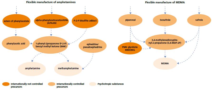 APAAN alpha-phenylacetoacetonitrile ATS amphetamine-type stimulants BMK benzyl methyl ketone CICAD Inter-American Drug Abuse Control Commission (Organization of American States) EMCDDA European Monitoring Centre for Drugs and Drug Addiction Europol European Police Office FAO Food and Agriculture Organization of the United Nations GDP gross domestic product INCB International Narcotics Control Board ISIC International Standard Industrial Classification INCSR International Narcotics Control Strategy Report, of the United States State Department LSD lysergic acid diethylamide MDA 3,4-methylenedioxyamphetamine MDMA 3,4-methylenedioxymethamphetamine 3,4-MDP-2-P 3,4-methylenedioxyphenyl-2-propanone NSDUH National Survey on Drug Use and Health of the Substance Abuse and Mental Health Services Administration of the Department of Health and Human Services of the United States of America P-2-P 1-phenyl-2-propanone PEN Online Pre-Export Notification Online PICS Precursors Incident Communication System PMK piperonyl methyl ketone PWID people who inject drugs UNAIDS Joint United Nations Programme on HIV/AIDS UN COMTRADE United Nations Commodity Trade Statistics database UNIDO United Nations Industrial Development Organization UNODC United Nations Office on Drugs and Crime WHO World Health Organization