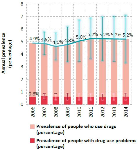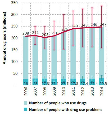 It is estimated that 1 in 20 adults, or a quarter of a billion people between the ages of 15 and 64 years, used at least one drug in 2014. Roughly the equivalent of the combined populations of France, Germany, Italy and the United Kingdom, though a substantial amount, it is one that does not seem to have grown over the past four years in proportion to the global population. Nevertheless, as over 29 million people who use drugs are estimated to suffer from drug use disorders, and of those, 12 million are people who inject drugs (PWID), of whom 14.0 per cent are living with HIV, the impact of drug use in terms of its consequences on health continues to be devastating.