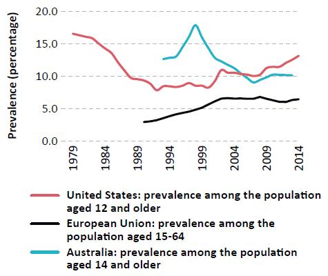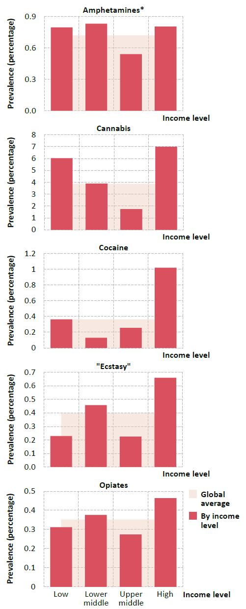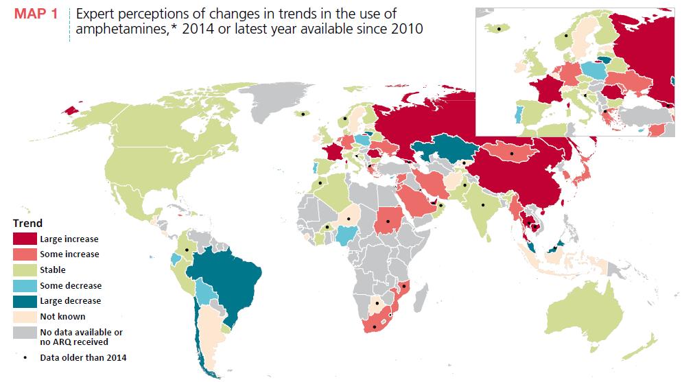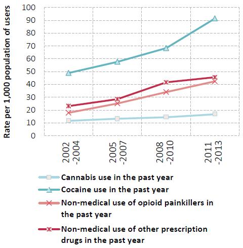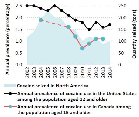 As an overall trend at the global level, the use of cannabis has remained stable over the past three years. In some sub-regions, however, particularly North America and Western and Central Europe, cannabis use has increased. After a period of stability, since 2010 cocaine use has also been rising, mainly because of an increase in cocaine use in South America. On the other hand, the use of amphetamines appears to be stable, but that may underplay the situation in subregions, specifically East and South-East Asia, where recent information on the extent of drug use is unavailable.