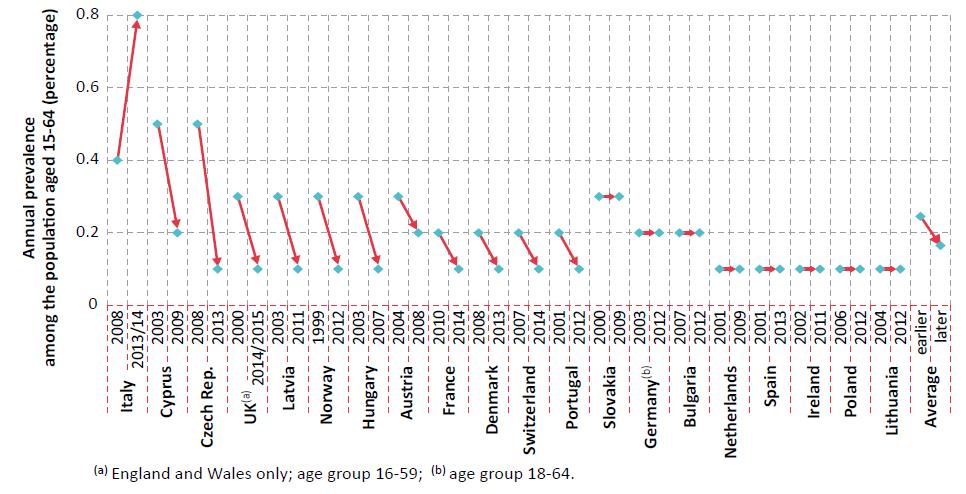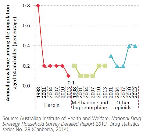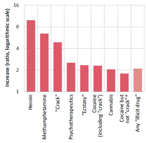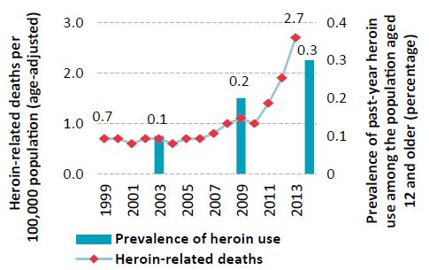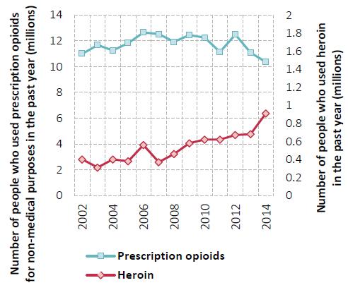 Cannabis remains the most commonly used drug at the global level, with an estimated 183 million people having used the drug in 2014, while amphetamines remain the second most commonly used drug. With an estimated 33 million users, the use of opiates and prescription opioids is less common, but opioids remain major drugs of potential harm and health consequences. The fact that a sharp increase in heroin use has been documented in some markets (particularly North America) where it was previously declining, shows that heroin remains one of the major drugs of public health concern.