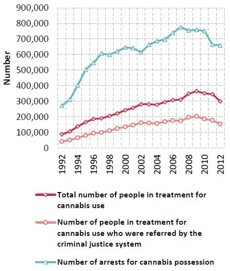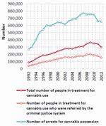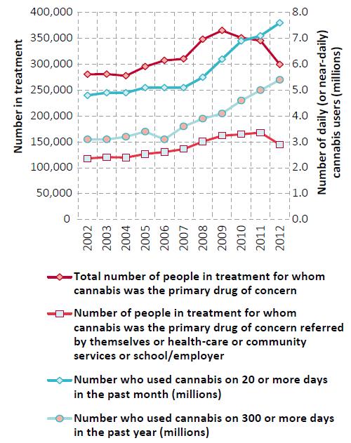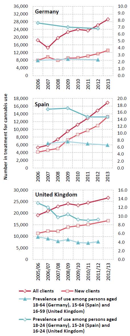 Treatment related to cannabis use has been increasing in many regions over the past decade. In Europe, an increase in the numbers in treatment for cannabis use has been observed in several countries, despite a decline in the number of frequent (monthly) users. The proportion of people seeking treatment for the first time for cannabis use disorders remains high globally, with nearly half of the people treated for cannabis use disorders being first-time entrants. Changes in patterns of the people in treatment for cannabis use may be attributed to a number of factors, including practices in referrals by the criminal justice system and an expansion in the provision of treatment for cannabis in some countries. While there is some evidence that higher potency cannabis is now more widely available in Europe and the United States, how this might translate into greater harm for cannabis users is not clearly understood.
