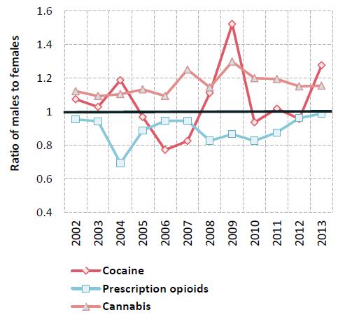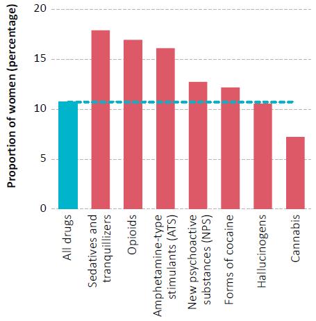 Overall, men are three times more likely than women to use cannabis, cocaine or amphetamines, whereas women are more likely than men to engage in the non-medical use of opioids and tranquilizers. Gender disparities in drug use are more attributable to opportunities to use drugs in a social environment than to either gender being more or less susceptible or vulnerable to the use of drugs. Moreover, while in most surveys the prevalence of drug use among young people is reportedly higher than among adults, the gender divide in drug use is narrower among young people than among adults.