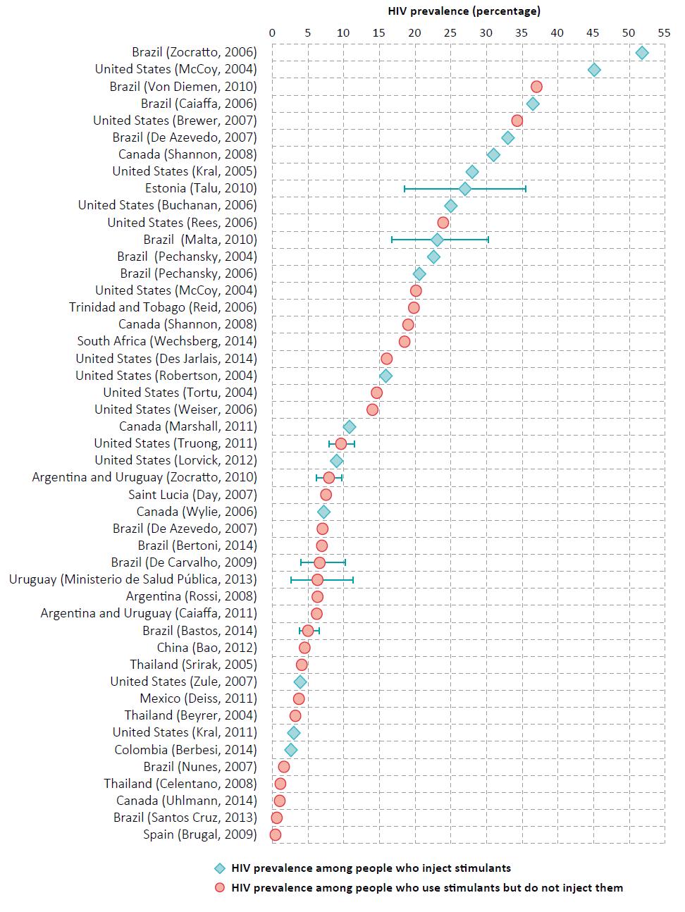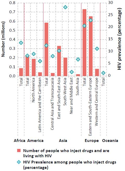 PWID experience some of the most severe health-related harms associated with unsafe drug use, overall poor health outcomes, including a high risk of non-fatal and fatal overdoses, and a greater chance of premature death. One in seven PWID is living with HIV, and one in two with hepatitis C. PWID are a key at-risk population for HIV and hepatitis, with almost a third of new HIV infections outside sub-Saharan Africa occurring among PWID. Moreover, studies have found people who inject stimulants to engage in more risky sexual behaviours, resulting in a higher risk of HIV infection than for those injecting opiates.