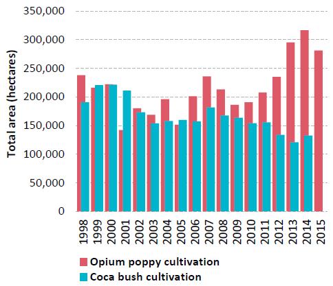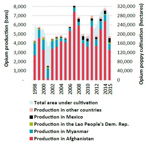 Primarily carried out in South-West Asia and, to a lesser extent, in South-East Asia and Latin America, global opium production in 2015 fell by 38 per cent from the previous year to some 4,770 tons, i.e., to the levels of the late 1990s. The decrease was primarily a consequence of a decline in opium production in Afghanistan (a decrease of 48 per cent from the previous year), mainly as a result of poor yields in the country's southern provinces. However, at 183,000 hectares, Afghanistan still accounted for almost two thirds of the global area under illicit opium poppy cultivation, which decreased by 11 per cent from the previous year to around 281,000 hectares.
