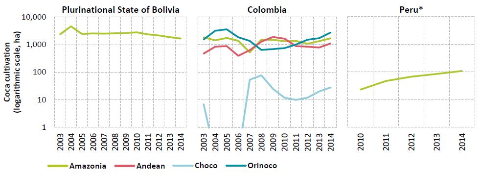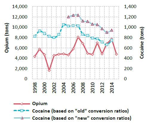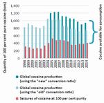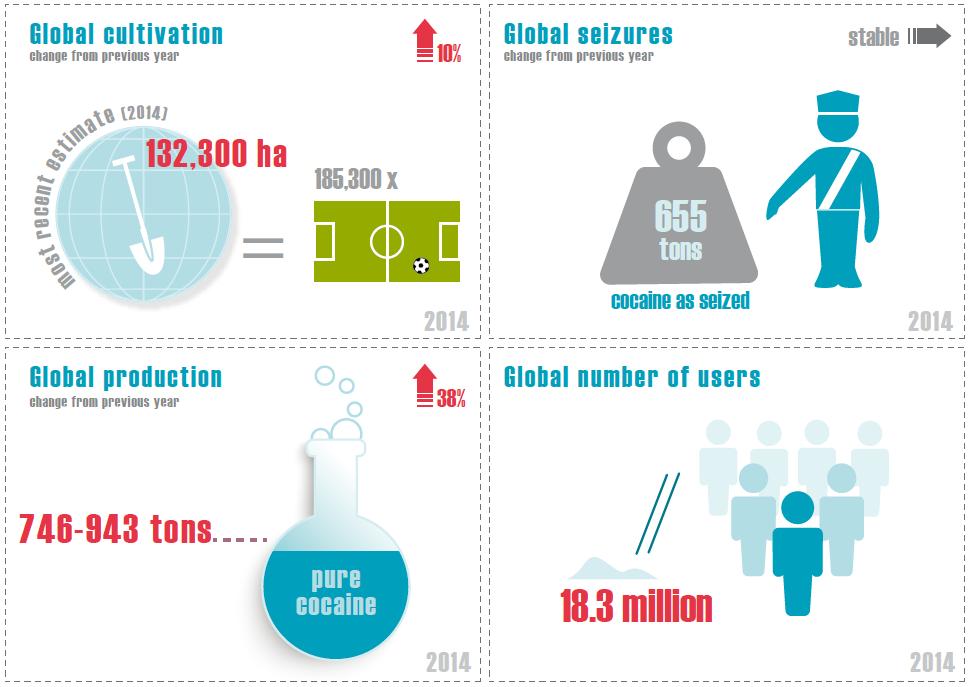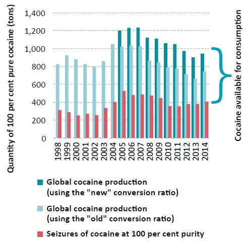 Although global coca bush cultivation in 2014 increased by 10 per cent from the previous year, the actual area under coca bush cultivation was the second smallest since the late 1980s. Global cocaine manufacture was slightly higher than in the previous year but still 24-27 per cent lower than the peak in 2007, and thus basically back to the levels reported in the late 1990s. At the same time, there are indications that the increase in global cocaine manufacture observed in 2014 was not a one-off event and may have continued in 2015.