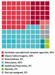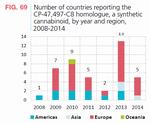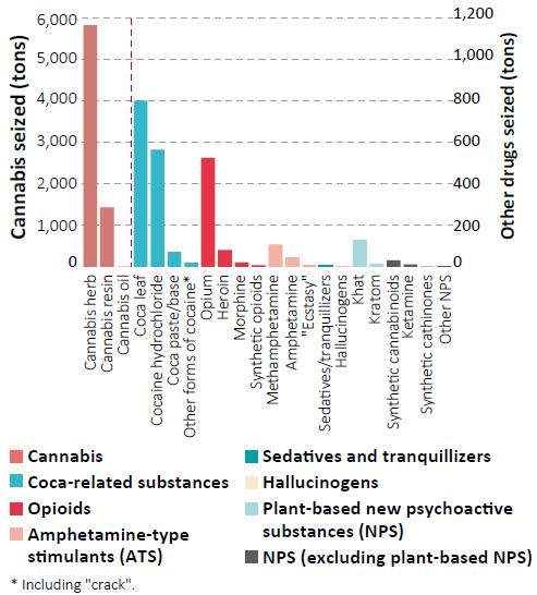 Cannabis also continues to be the most trafficked drug worldwide, while there has been a large increase in seizures of synthetic drugs. Although there were 234 substances under international control in 2014 (244 in January 2016), the bulk of trafficking (based on reported drug seizures, which reflect both law enforcement activity and drug flows) was concentrated on a far smaller number of substances. Cannabis in its various forms was intercepted in 95 per cent of reporting countries in 2014 and accounted for over half of the 2.2 million drug seizure cases reported to the United Nations Office on Drugs and Crime (UNODC) that year, followed by ATS, opioids and coca-related substances.