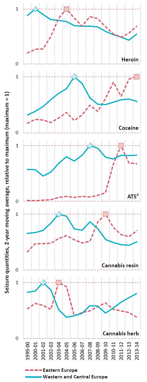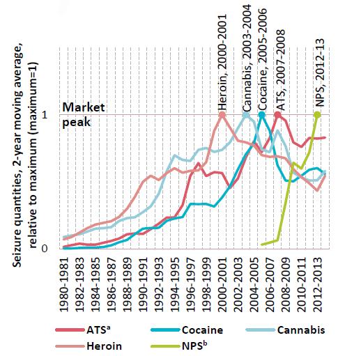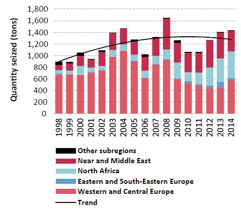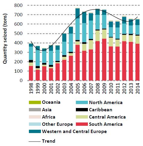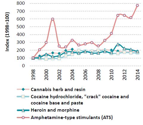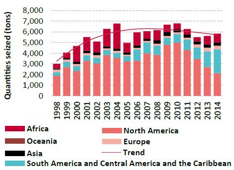 Trends in the quantities of drugs seized worldwide, 1998-2014