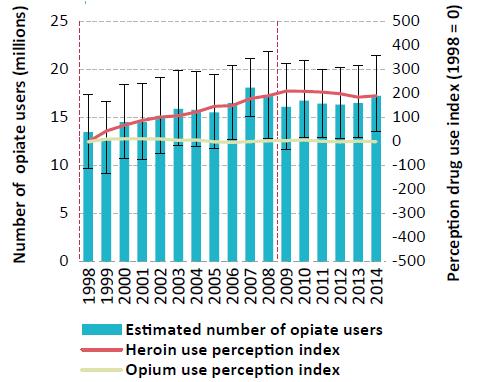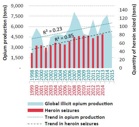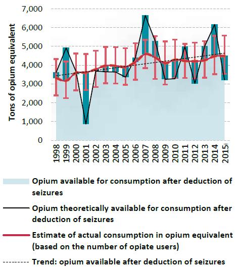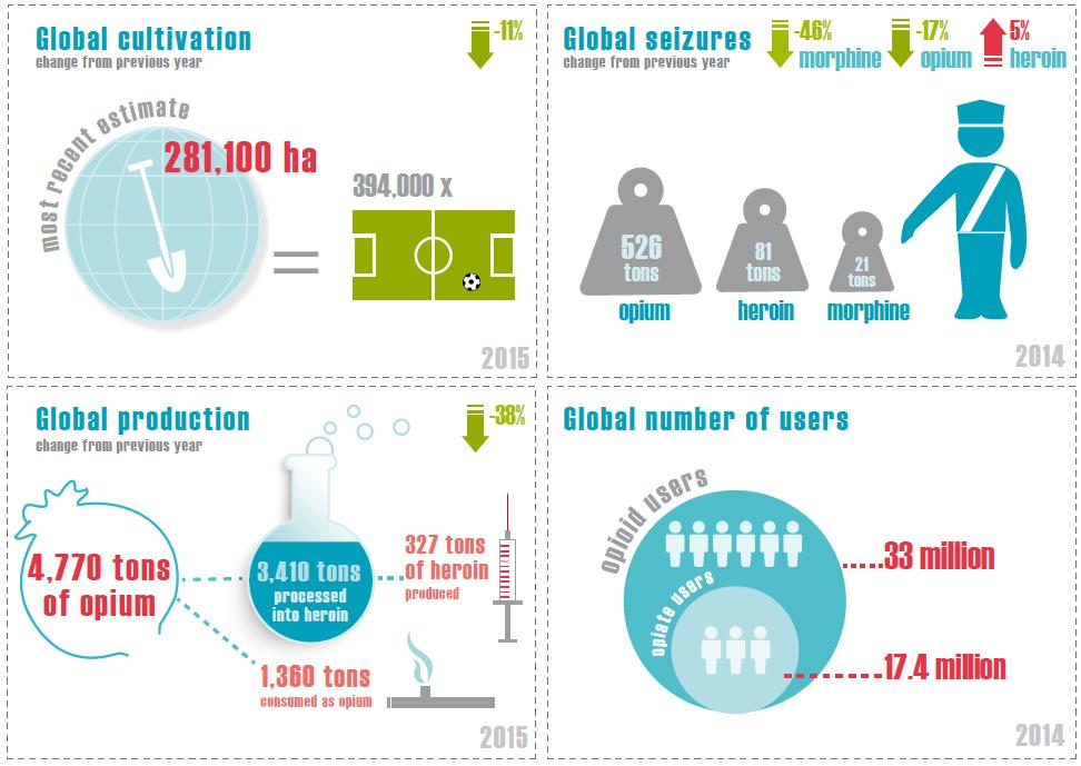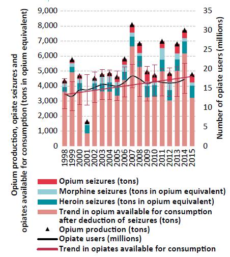 UNODC estimates indicate that the global number of opiate users (i.e., users of opium, morphine and heroin) has changed little in recent years and that opiates continued to affect some 17 million people in 2014. It seems unlikely that the sharp decline in opium production in 2015 will lead to major shortages in the global heroin market given the high opium production levels of previous years. The build-up or depletion of previous years' opium inventories may be used to offset annual changes in production and maintain the supply of heroin to user markets. It may take a period of sustained decline in opium production for the repercussions to be felt in the heroin market.