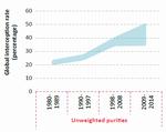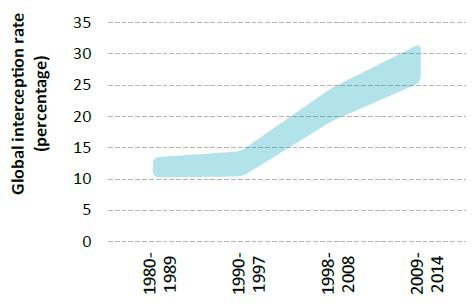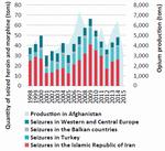 The global interception rate for opiates doubled from the period 1980-1997 (particularly after the special session of the General Assembly on the world drug problem in 1998) to the 2009-2014 period. The largest amount of opiates seized takes place in South-West Asia, followed by Europe. Accounting for 75 per cent of global opium seizures, 61 per cent of global morphine seizures and 17 per cent of global heroin seizures, the largest aggregated opiate seizures worldwide in 2014 were reported by the Islamic Republic of Iran.