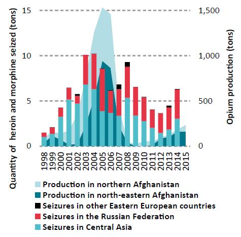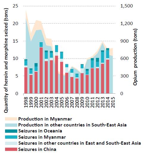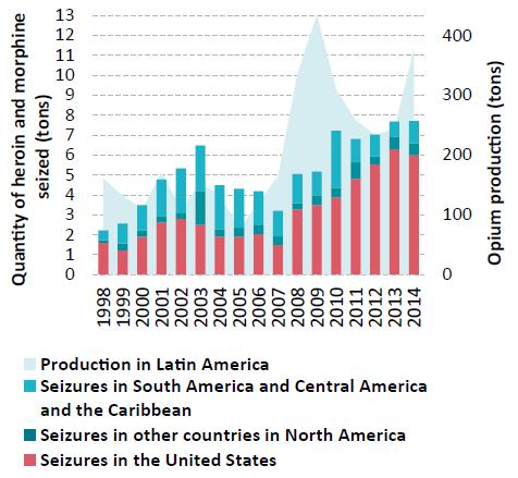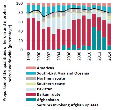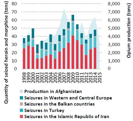 The so-called "Balkan route", which supplies Western and Central Europe with Afghan opiates, through Iran (Islamic Republic of) and Turkey via South-Eastern Europe, continues to be the most important conduit for heroin trafficking. However, the so-called "southern route" (through Pakistan or the Islamic Republic of Iran by sea to the Gulf region, Africa (particularly East Africa), South Asia and, to a lesser extent, South-East Asia, the Oceania region and North America), has grown in importance. Meanwhile, opiate trafficking on the so-called "northern route", from Afghanistan to neighbouring States in Central Asia, the Russian Federation and other countries of the Commonwealth of Independent States, has started to undergo a resurgence after the decline in the period 2008-2012, while trafficking out of the Golden Triangle is on the increase, mainly due to rising levels of opium production in Myanmar after 2006. Moreover, heroin trafficking in the Americas continues to increase, with heroin and morphine seizures rising from an average of 4 tons over the period 1998-2008 to 7 tons per year over the period 20092014, in line with reported increases in opium production in Latin America over those periods.