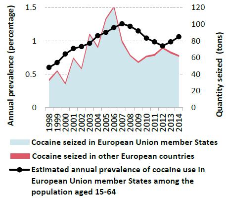 Cocaine trafficking via Africa may be regaining importance, and there are signs of increases in the trafficking of cocaine to Asia, particularly to East and South-East Asia and the Middle East, as cocaine seizures in Asia tripled from an average of 0.45 tons per year over the period 1998-2008 to 1.5 tons per year over the period 20092014. In Oceania, the cocaine market appears to be stabilizing, following rapid growth over the past decade.