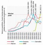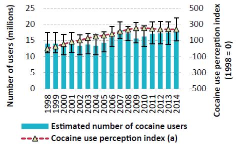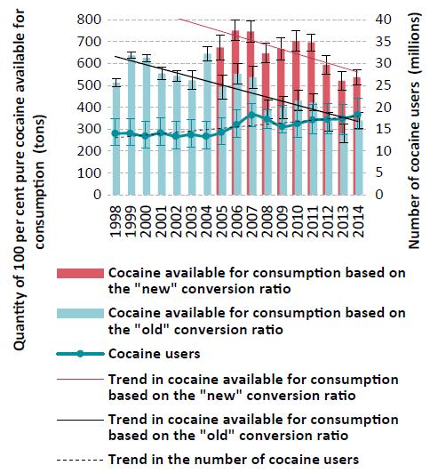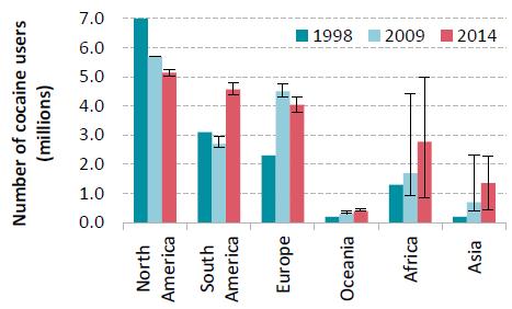 Despite these regional fluctuations, the annual prevalence of cocaine use remained largely stable at the global level over the period 1998-2014, fluctuating at between 0.3 and 0.4 per cent of the population aged 15-64. However, as the population has grown, the number of cocaine users has increased, from some 14 million in 1998 to 18.8 million in 2014. Meanwhile, it is likely that there has been a decline in per capita consumption of cocaine, prompted by a decline in the amount of cocaine available for consumption over the period 2007-2014, mainly linked to a drop in cocaine production in the Andean region. In parallel, the number of heavy cocaine users in North America has declined. This points to an overall shrinking of the cocaine market, although the number of (recreational rather than regular) cocaine users in several emerging markets continues to rise.