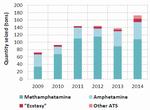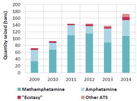 After three years of relative stability, ATS seizures reached a new peak of more than 170 tons in 2014. Since 2009, global amphetamine seizures have fluctuated annually between about 20 and 46 tons, while "ecstasy" seizures more than doubled in 2014, to 9 tons, compared with the annual averages of 4-5 tons since 2009. For the past few years, methamphetamine seizures have accounted for the largest share of global ATS seizures annually, but, although methamphetamine is a feature of ATS markets worldwide, it is particularly dominant in East and South-East Asia and North America. Since 2009, those subregions together have annually accounted for most global methamphetamine seizures. Compared with other subregions, North America has consistently reported the largest amount of methamphetamine seizures each year, whereas between 2009 and 2014, methamphetamine seizures reported in East and South-East Asia almost quadrupled.