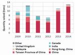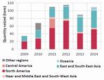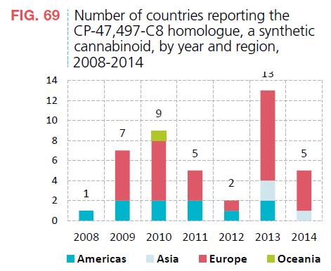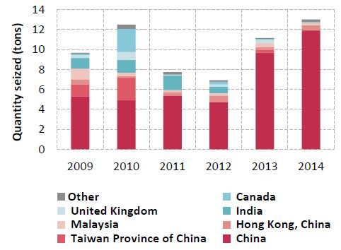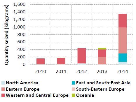 Significant quantities of NPS seized have been reported over the past few years. The global market for synthetic NPS continues to be dominated by synthetic cannabinoids (seizures of 32 tons), with North America (specifically the United States with 26.5 tons of seizures) accounting for the largest quantities seized worldwide in 2014, out of the global total of 34 tons (excluding plant-based NPS and ketamine). However, global seizures of synthetic cathi-nones have been steadily increasing since they were first reported in 2010, with seizures tripling to 1.3 tons in 2014 from the previous year.