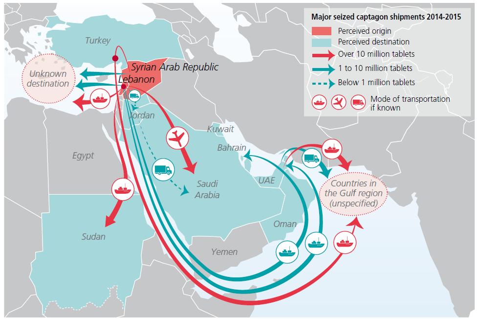 Large amounts of amphetamine tablets labelled with the brand name "Captagon" were reported to have been seized in the Middle East between March 2014 and November 2015. In 2013 and 2014, amphetamine seizures reported in the Middle East were mostly perceived to have originated in Lebanon and the Syrian Arab Republic. Over the same period, some countries reporting amphetamine seizures in the Middle East found that these were intended for trafficking onward to other destinations within the region.