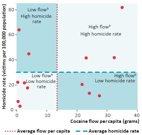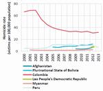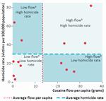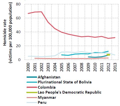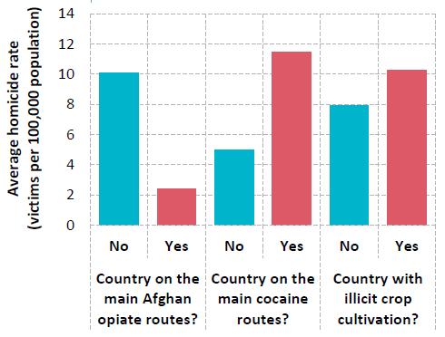 153. Bivariate correlations between homicide rates and each of these categories appear statistically significant in the categories "Country on the main Afghan opiate routes?", "Country on the main cocaine routes?", but not in the "Country with illicit crop cultivation?" category (possibly because only 17 countries are in the latter category). [Back]