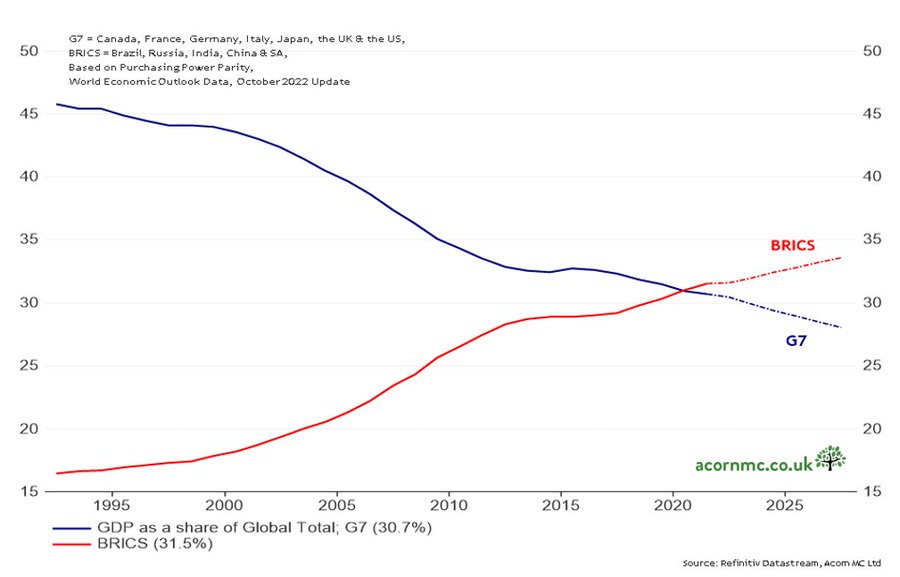 À l'échelle mondiale, le taux des BRICS est à 31,5% contre 30,7% pour le G7, selon les données du mois d'octobre 2022, relayées par Refinitiv Datastream et la société britannique de recherche macroéconomique Acorn Macro Consulting.