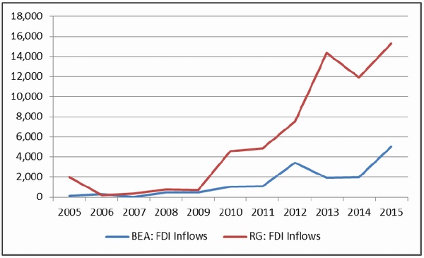 Figure 14. BEA and Rhodium Group Data on Chinese FDI Flows to the United States: 2005-2015