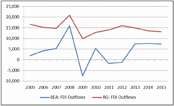 Figure 13. BEA and Rhodium Group Data on Annual U.S. FDI Flows to China: 2005-2015