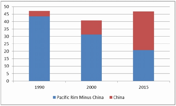 Figure 6. U.S. Manufactured Imports from Pacific Rim Countries as a Percentage of Total U.S. Manufactured Imports: 1990, 2000, and 2015