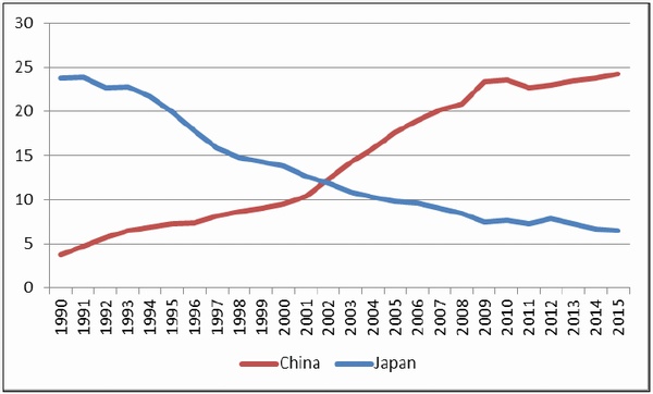 Figure 7. U.S. Manufactured Imports from China and Japan as a Percentage of U.S. Total: 1999-2015 (%)