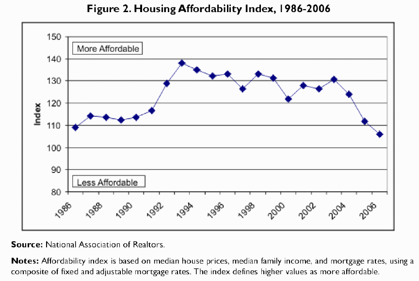 At the same time housing prices and high risk loans were increasing, the National Association of Realtors' housing affordability index showed that, by 2006, housing had become less affordable than at any point in the previous 20 years, as presented in the graph below. |1015| The "affordability index" measures how easy it is for a typical family to afford a typical mortgage. Higher numbers mean that homes are more affordable, while lower numbers mean that homes are generally less affordable.