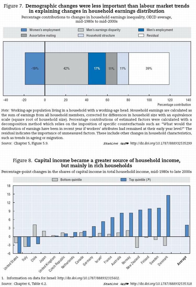 Changes in the earnings distribution account for much but not all of the trends in household income inequality in OECD countries. A much debated driver of income inequality in OECD countries is the distribution of incomes from capital, property, investment and savings, and private transfers. Such distribution has grown more unequal over the past two decades. Capital income, in particular, saw a greater average increase in inequality than earnings in two-thirds of OECD countries between the mid-1980s and the late 2000s.